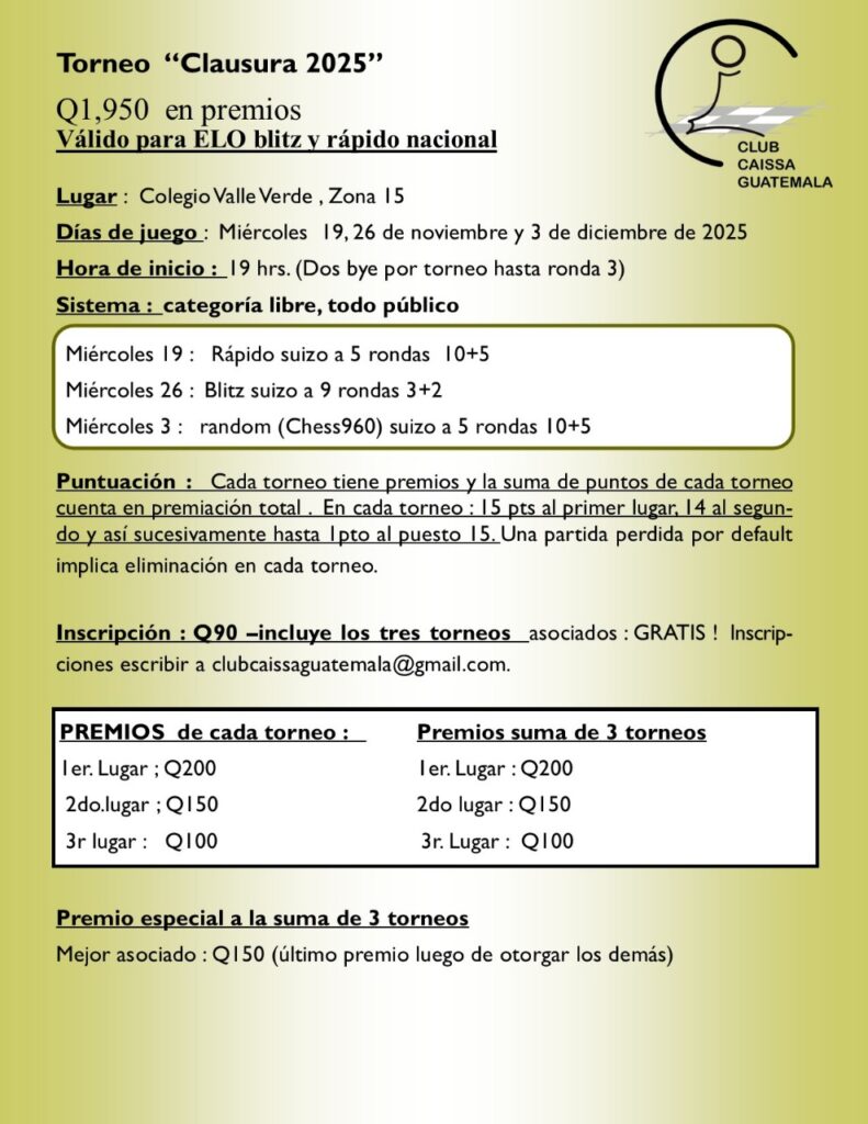 - Abierto a todo público. Inscripciones: enviar correo y boleta de pago a clubcaissaguatemala@gmail.com
