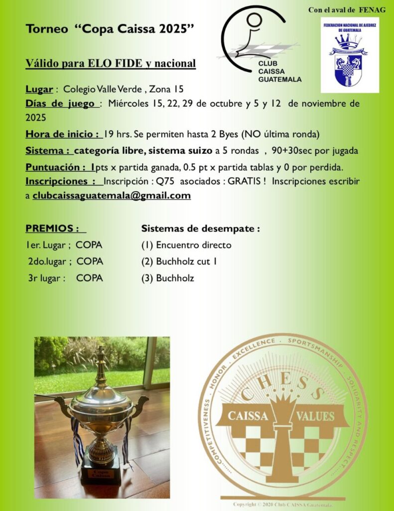 Torneo Copa Caissa 2025 Ritmo clásico 90+30 (presencial) Suizo, 5 rondas. Inicio miércoles 15 de octubre Lugar: Colegio Valle Verde zona 15 Posiciones, resultados, pareos: Enlace del evento