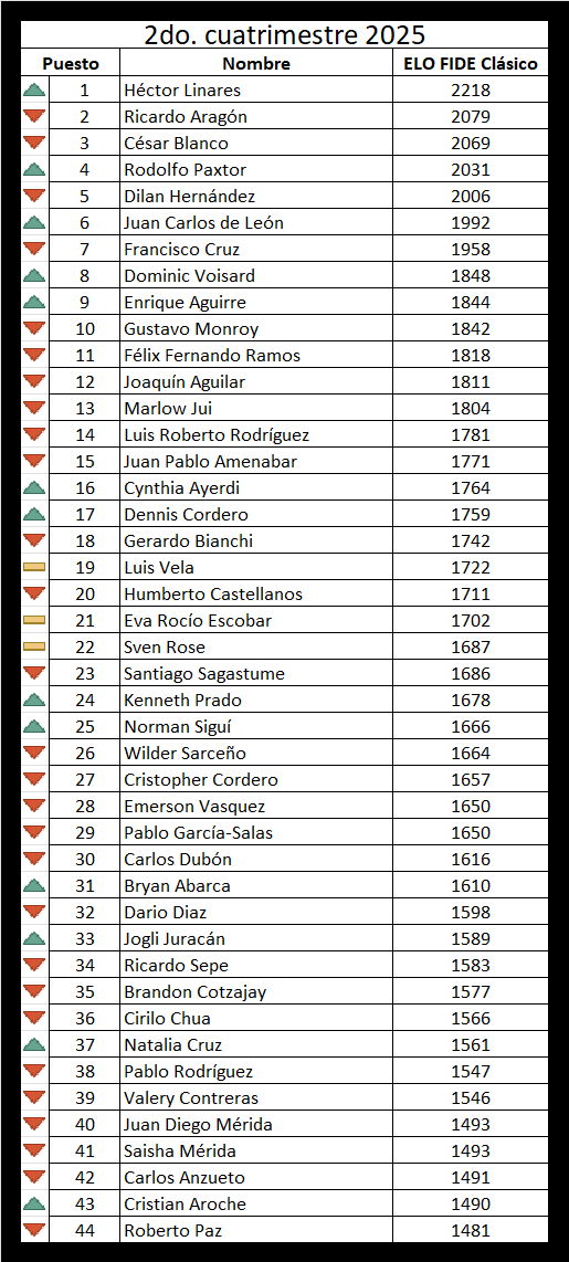 - El ELO mostrado, es el registrado para ritmo clásico final mes de agosto 2025, en el sitio oficial de la FIDE: https://ratings.fide.com